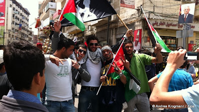 Wer des Arabischen nicht mächtig ist und es nicht besser weiss, könnte an diesem Sonntag in Ramallah den Eindruck eines riesigen Volksfests bekommen. Jung und alt sind auf den Strassen, an einem der grösseren Plätze der Stadt treten auf einer Bühen mehr oder weniger bekannte Sänger, Musikgruppen und Tänzer auf, und die Stimmung ist friedlich und ausgelassen. Alle Hausdächer rund um das Geschehen sind bevölkert, überall sieht man palästinensische Fahnen und Keffiyas. Nur die Liedtexte à la "Wir schwören, dass wir dieses Land niemals verlassen werden" deuten auf den Anlass - Nakba, Gedenken an die Vertreibung.